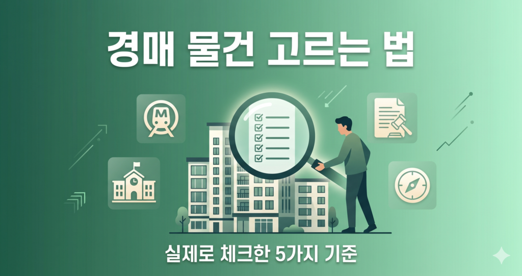 이 다섯 가지가 완벽한 기준은 아닙니다. 저도 세 번의 입찰을 거치면서 하나씩 추가한 것들입니다. 하지만 적어도 이 기준이 있으면, 수백 개의 물건 앞에서 막막해지지는 않습니다. 경매 물건 고르는 법은 한 번에 완성되지 않습니다. 경험이 쌓이면서 기준도 함께 자랍니다.